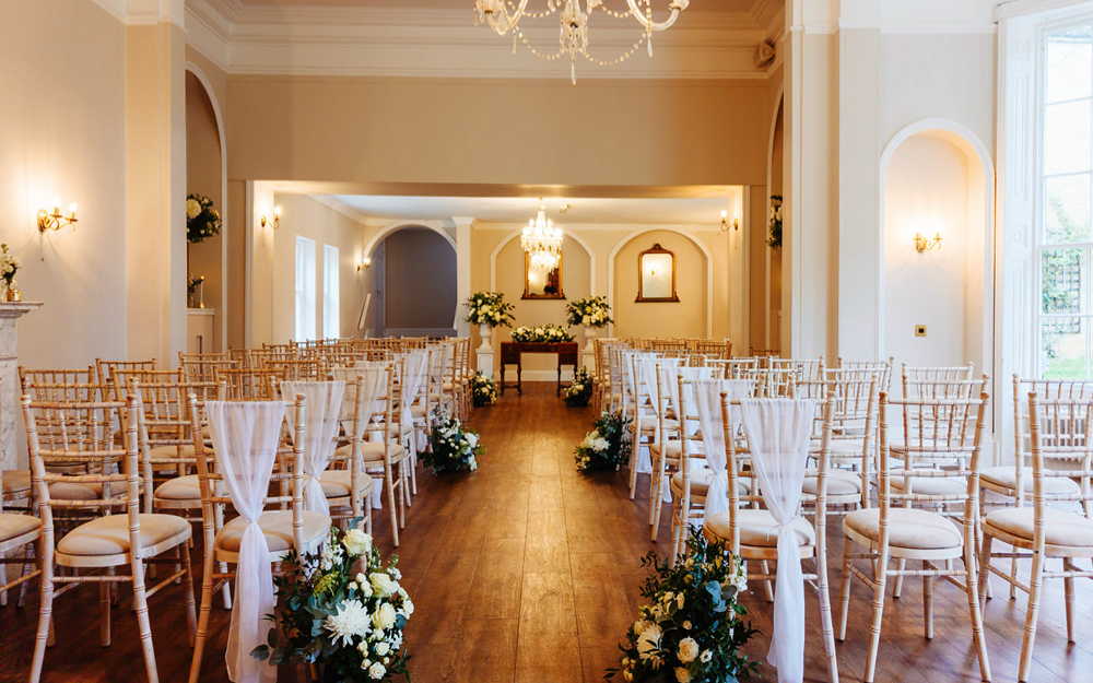 Our beautifully proportioned ceremony and reception rooms have high ceilings, soft lighting and views of our picture-perfect grounds outside.